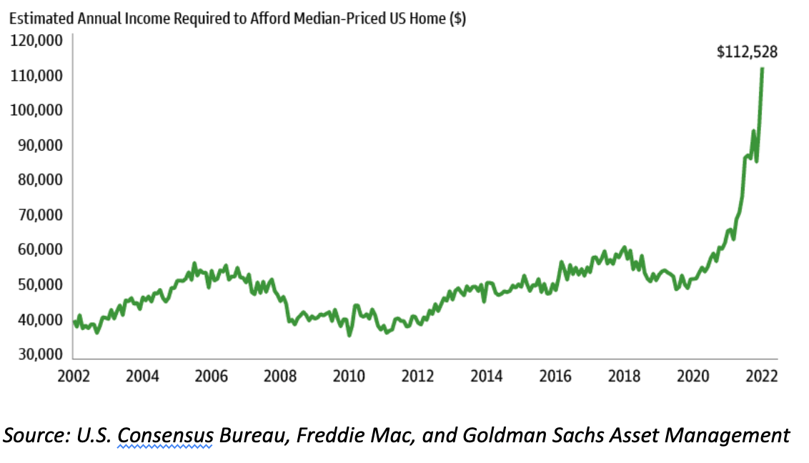 Along with the chart, which was put together by Goldman Sachs Asset Management, was the comment: “Long considered a key pillar of wealth creation, home ownership in the United States has shown its teeth as mortgage rates have more than doubled over the previous twelve months. In our estimate, servicing the costs of owning a home in today’s market has increased by 71% from the year prior.”