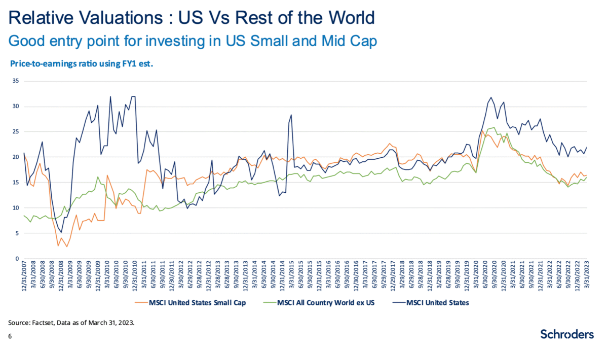 A good starting point to support US smaller companies is that today’s valuations are already pricing in a lot of bad news. Smaller companies have not been so cheap relative to large caps since the technology bubble in 1999-2001. Indeed, US smaller companies trade at similar valuations to markets outside the US for the first time in years, meaning you can still invest in the US economy without paying a premium.