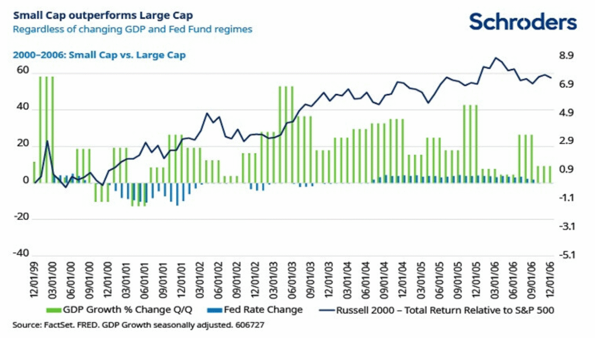 This outperformance from smaller companies occurred when the Federal Reserve (Fed) funds rates and economic growth were both rising and falling. This consistent outperformance through a variety of different economic environments occurred from a similar starting point. Past performance is no guide to the future, of course, but we see many similarities with the current environment.