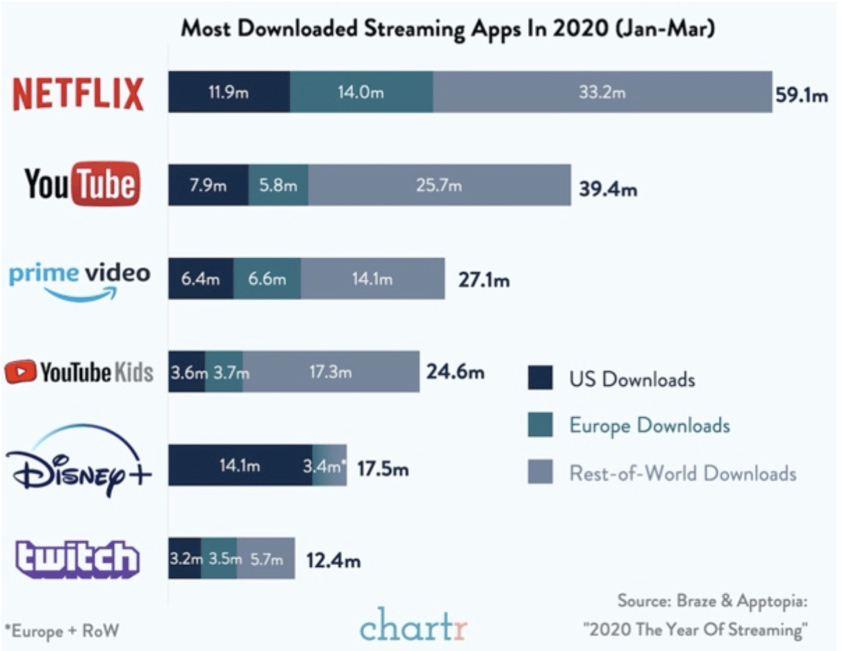 “Netflix downloads in Asia saw 28% year on year growth in February, as the virus took hold in that region. And such was the intensity of streaming activity in Europe that the EU had to request Netflix (and other streaming services) to restrict its bandwidth usage for fear of overburdening the network.”
