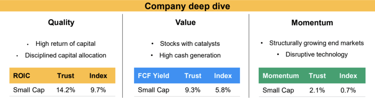 Stocks must be profitable and cash flow generative to be considered for inclusion. The quality of the business is evaluated through the profitability, sustainability of earnings and capital allocation discipline, while the company valuation is assessed to see if its prospects have been incorrectly estimated by the market.