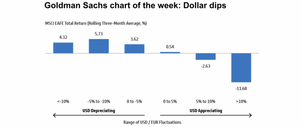Goldman Sachs Asset Management believes the tide is turning in favour of equities outside the US, driven by an improving economic outlook, especially in the Euro area, and US dollar weakness. “Historically, periods of US dollar weakness have coincided with strong performance for equities outside the US. In a world of heightened market volatility, we also believe that their elevated dividend yields may support total returns,” it said.