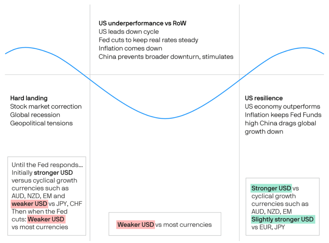 As many will be aware, the dollar smile has been a heavily-used framework for FX investors for a number of years. When global growth is strong – the middle of the smile – the dollar tends to underperform other currencies, while in times of US outperformance or during a global recession, the US dollar is your friend. JPMorgan believes the smile is becoming more of a smirk, as it may no longer be a safe haven during times of distress.
